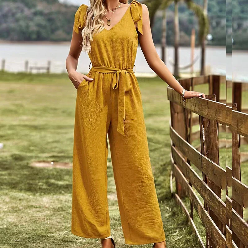 2025 Summer Casual Waist Cinching Slimming Jumpsuit Pants Halter Collar Ankle-Length Solid Pattern Sashes for Commuting